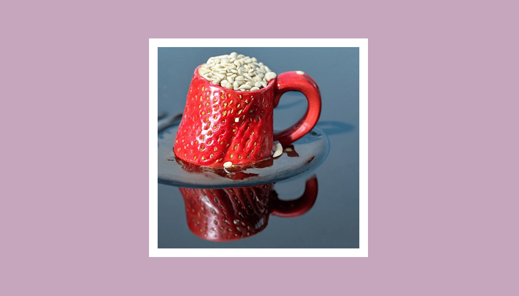 Come non rimanere impressionati e ingolositi di fronte all’immagine di una tazza a forma di fragola riempita di semi di sesamo che galleggia in un mare di cioccolato fuso.