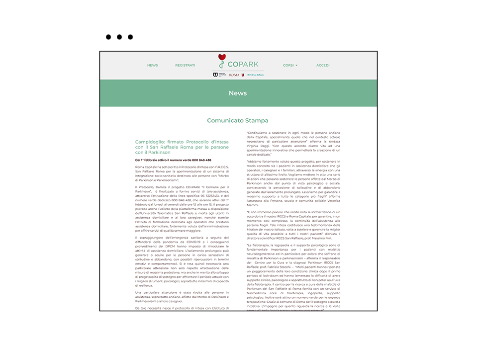 Da tale necessità nasce quindi il Protocollo d’Intesa sottoscritto da Roma Capitale e dall’Istituto di Ricovero e Cura a Carattere Scientifico San Raffaele Roma Pisana, in particolare con il Centro Parkinson diretto dal Prof. Fabrizio Stocchi.