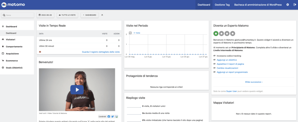 Adesso puoi cominciare a prendere confidenza con l’interfaccia di Matomo: andando su Matomo Analytics > Rapporti potrai accedere direttamente all’intuitiva dashboard di Matomo oppure se vuoi puoi iniziare dalla voce Matomo Analytics > Riassunto che ti consente di vedere direttamente in Wordpress i dati più importanti relativi al tuo sito Wordpress.