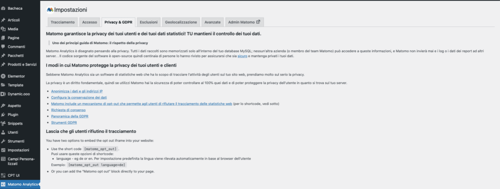 Il menù Privacy dell’interfaccia di Matomo for Wordpress si completa con altre 3 interessanti voci che ti potranno consentire di conoscere tutto quello che c’è da sapere per non incorrere in sanzioni legati alla Privacy ed al GDPR.