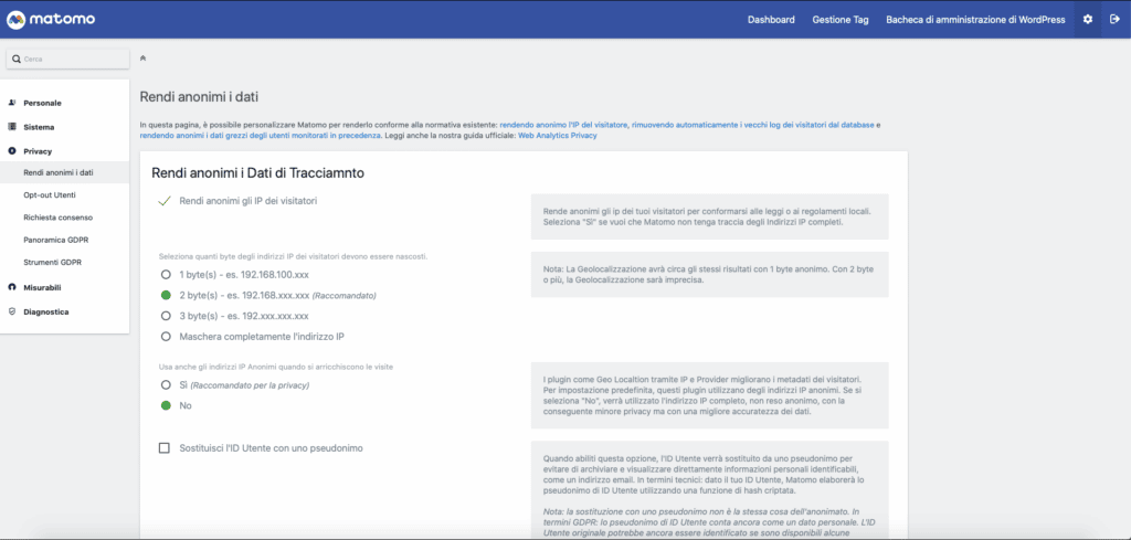 La schermata ti presenta un rassicurante “Rende anonimi gli ip dei tuoi visitatori per conformarsi alle leggi o ai regolamenti locali. Seleziona "Sì" se vuoi che Matomo non tenga traccia degli Indirizzi IP completi.”