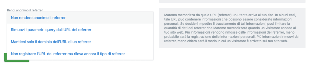 Matomo memorizza da quale URL (referrer) un utente arriva al tuo sito. In alcuni casi, tale URL può contenere informazioni che possono essere considerate informazioni personali. Se desideri impedire il tracciamento di tali informazioni, puoi limitare la quantità di dati dei referrer che Matomo memorizzerà quando un visitatore accede al tuo sito web. Più informazioni vengono rimosse dalle informazioni del referrer, meno probabile sarà la registrazione delle informazioni personali. Più informazioni rimuovi dal referrer, meno chiaro sarà il modo in cui un visitatore è arrivato sul tuo sito web.